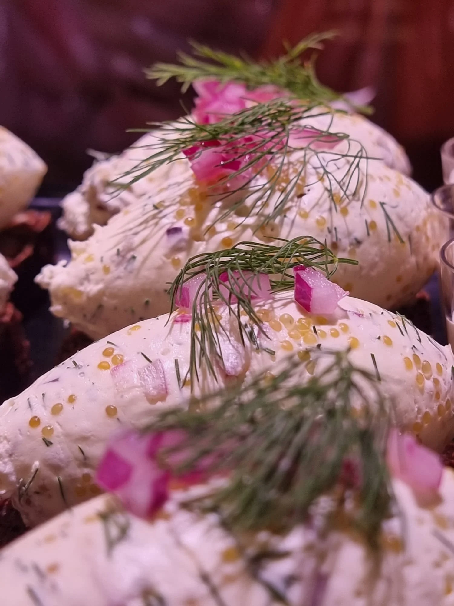kylmäsavuherkku, kirjolohenmäti aaltomaljassa